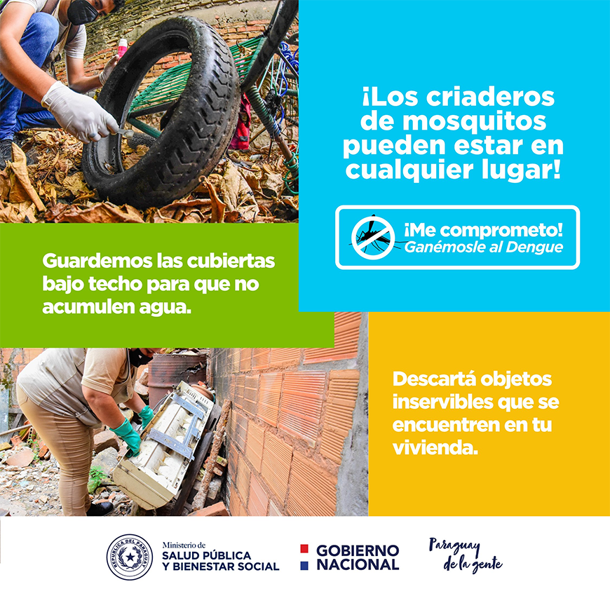 •   Desechar todo objeto en desuso que acumule agua (tapitas, botellas, envases). Aquellos objetos inservibles que no puedan desecharse como aparatos domésticos, neumáticos u otros, deben colocarse bajo techo o cubrirse de forma a evitar que puedan acumular agua.