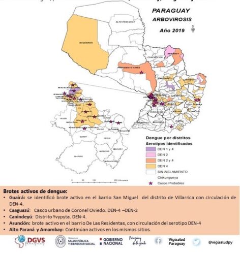 Central cuenta con circulación de tres serotipos DEN-1, DEN-2 y DEN-4, Amambay, Caaguazú, Canindeyú, Concepción y Presidente Hayes verifican circulación del DEN-2 y DEN-4; y San Pedro Sur refiere los serotipos DEN-1 y DEN-4, mientras que en el resto de los departamentos afectados se observa circulación del DEN-4, que es el serotipo predominante dentro del territorio nacional.