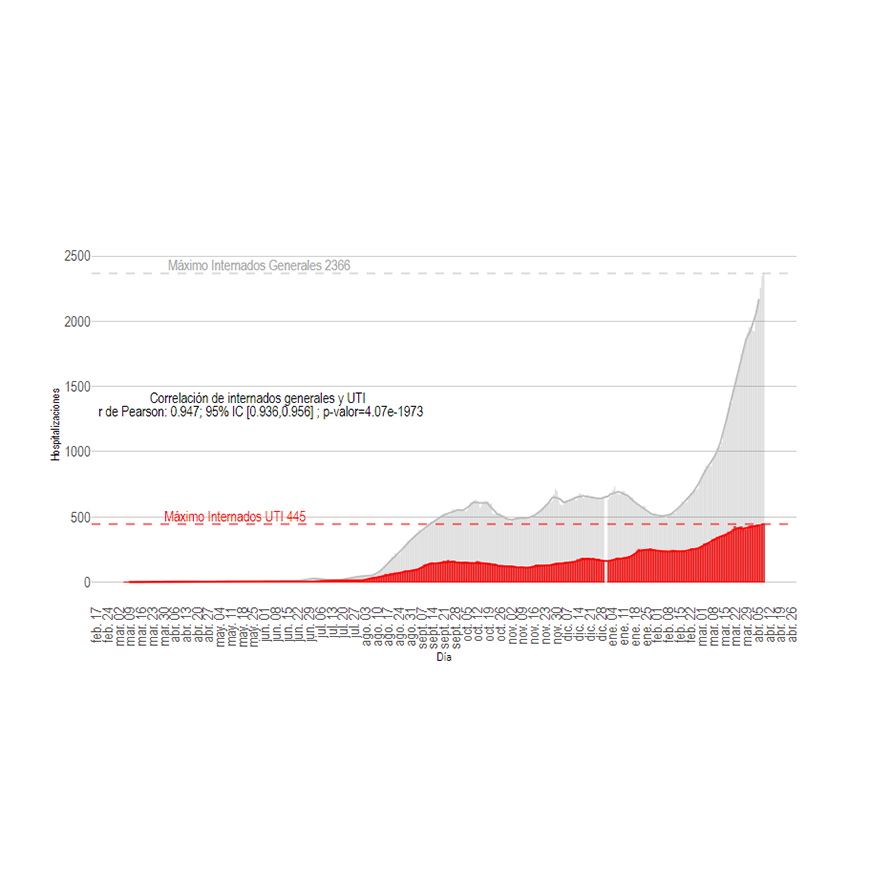 El número de internaciones en Unidades de Terapia Intensiva (UTI) muestra un récord máximo de 445 pacientes en un día, con una tendencia de aumento sostenido desde mediados de febrero. Las internaciones generales igualmente registran un repunte desde inicios de febrero, con un nuevo máximo de 2.366 pacientes reportados en un único día.