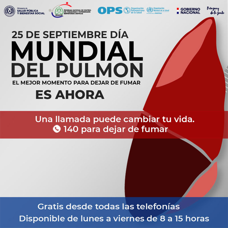 Bajo la consigna “Cuidar nuestros pulmones es más importante que nunca”, este sábado 25 de septiembre a las 09:00, realizará un acto en la Plaza de la Democracia para celebrar el Día Mundial del Pulmón, organizado por el Programa Nacional de Control del Tabaquismo y Enfermedades Respiratorias Crónicas (PRONATERC), con la colaboración del Instituto Superior de Bellas Artes.