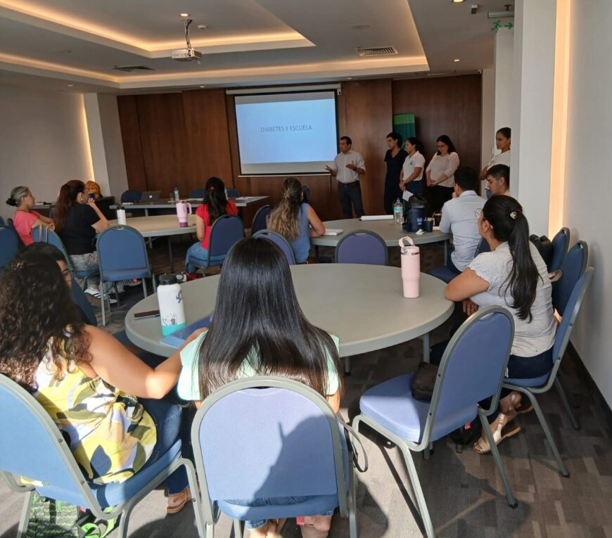 Durante el encuentro se realizó la presentación del modelo de protocolo individualizado para el manejo del estudiante con diabetes en la escuela, que fue analizado y evaluado junto a los padres y una docente invitada, incorporando aportes prácticos para su implementación institucional.