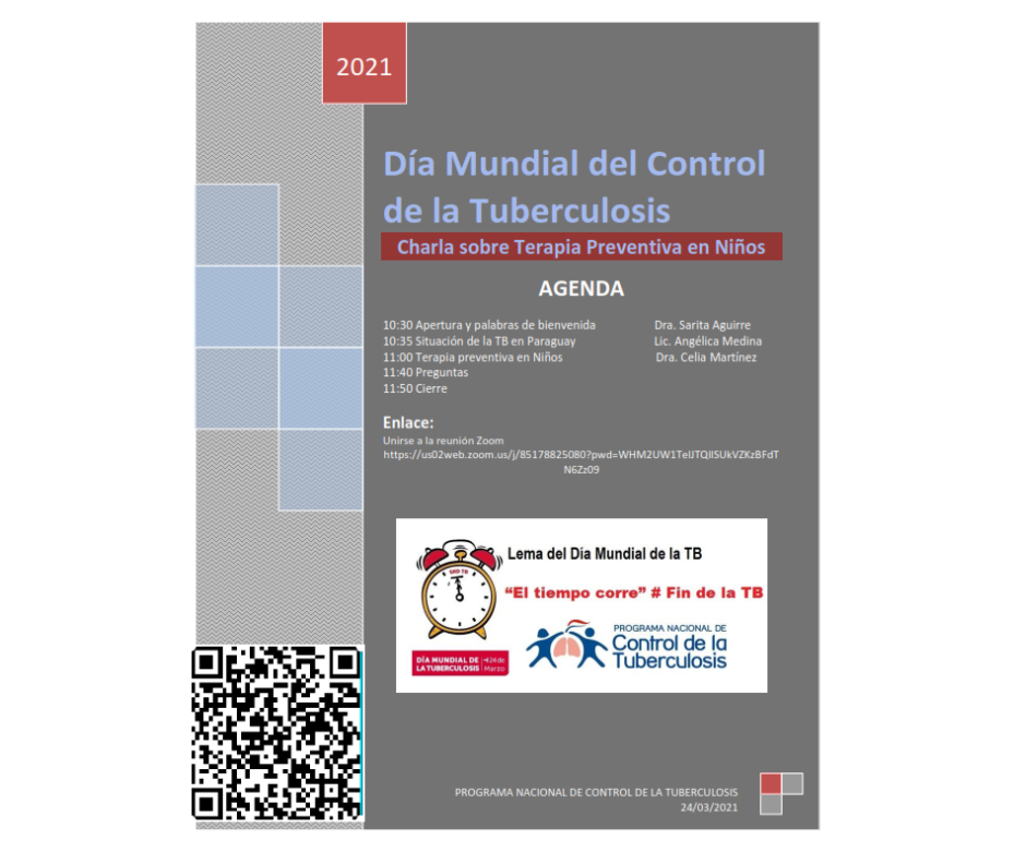 En conmemoración al Día Mundial de la Tuberculosis y bajo el lema: “El tiempo corre”, el Programa Nacional de Control de la Tuberculosis llevará adelante una charla sobre “Terapia preventiva en niños”, que será dictada en modo virtual Zoom, por la Dra. Celia Martínez, miembro del Comité Asesor de Tuberculosis de la OPS.
