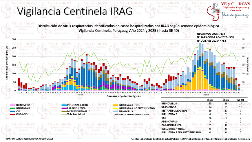En lo que va del año, suman 324 los fallecidos confirmados por virus respiratorios, principalmente por Influenza A H1N1, Rhinovirus y SARS-CoV-2. En la última semana (SE) 40 se identificaron 7 fallecidos asociados a virus respiratorios: Metapneumovirus (2), Rhinovirus (2), Virus Sincitial (1), SARS-CoV2 (1) e Influenza B (1).