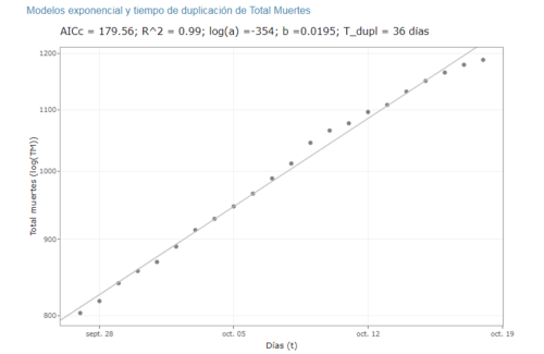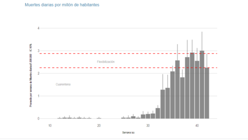 La tendencia actual es alejarse del umbral crítico de 8 muertes por millón de habitantes señalado por el Instituto de Métricas y Evaluación de la Salud (IHME). El tiempo de duplicación del número de muertes sigue desacelerado, con 36 días en contraste a los 32 días de la semana anterior.