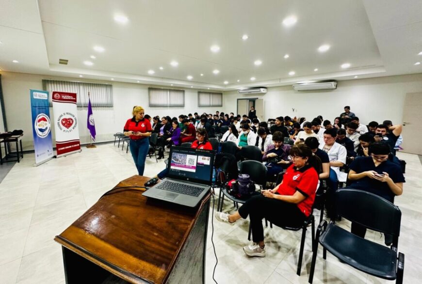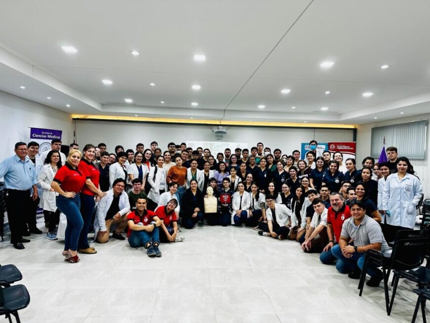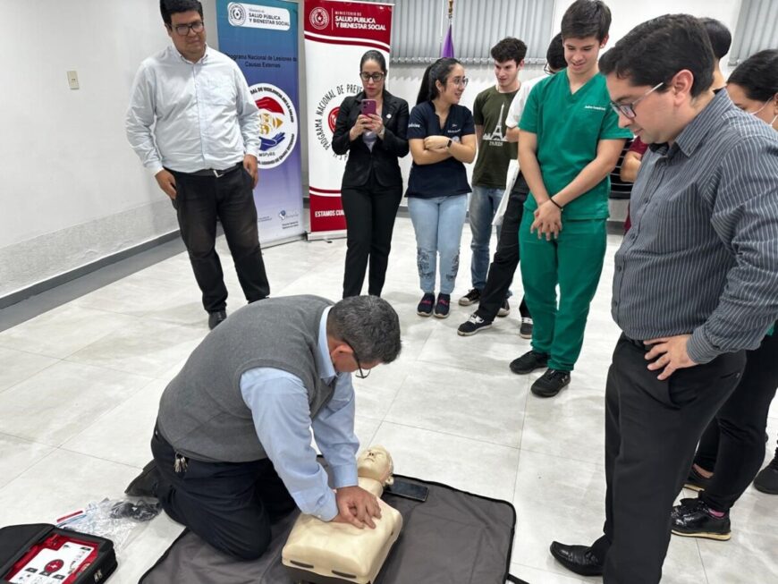 Profesionales del Programa Nacional de Prevención Cardiovascular y del Programa Nacional de Lesiones de Causas Externas del Ministerio de Salud impartieron una jornada de capacitación en maniobras de reanimación cardiopulmonar (RCP) básica y en el uso del desfibrilador externo automático (DEA) en la Facultad de Medicina de la Universidad Nacional de Caaguazú (UNCA).