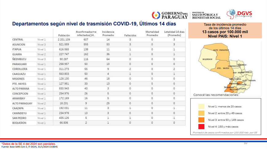 Hasta el momento, el Mapa de Riesgo señala que a nivel país se cuenta con una baja transmisión comunitaria, Nivel 1; mientras que los niveles por distrito y departamento, en Asunción y Ñeembucú se evidencia una alta transmisión – Nivel 3. Por su parte, Guairá y Alto Paraguay se ubican en el Nivel 2, mostrando una transmisión moderada.