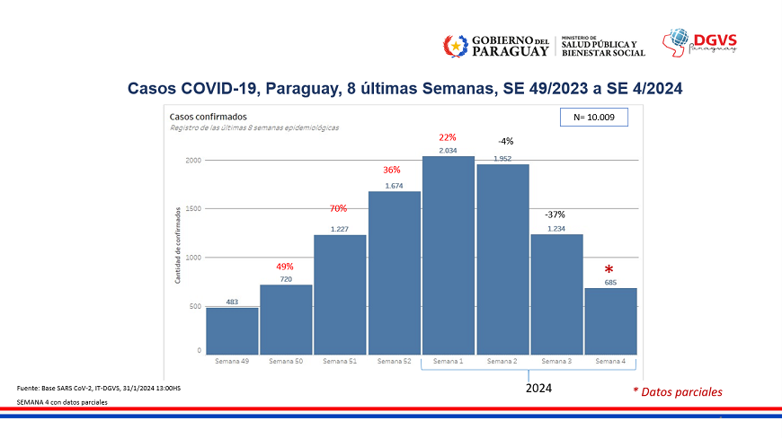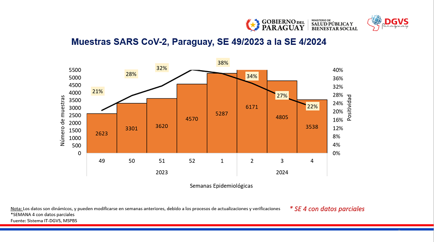 La cifra de personas diagnosticadas con COVID-19 a nivel país llega a 685 en la última semana, según datos parciales. La tasa de positividad actual asciende a 22%. Según grupo de edad, se observa un aumento de casos en el grupo de 20 a 39 años.