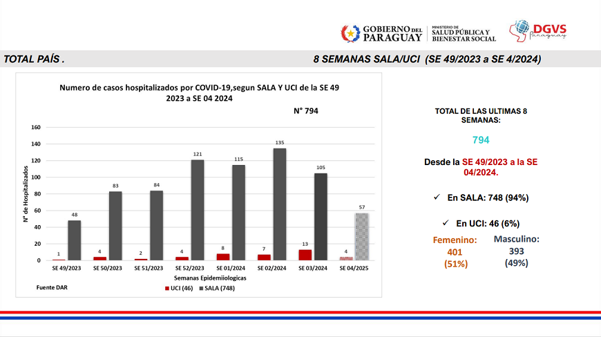 - Unas 61 personas fueron hospitalizadas, de los cuales, 4 ingresaron a cuidados intensivos y 6 fallecieron.
