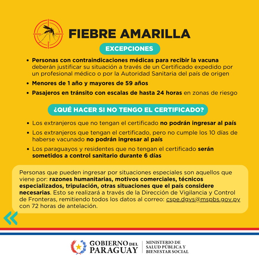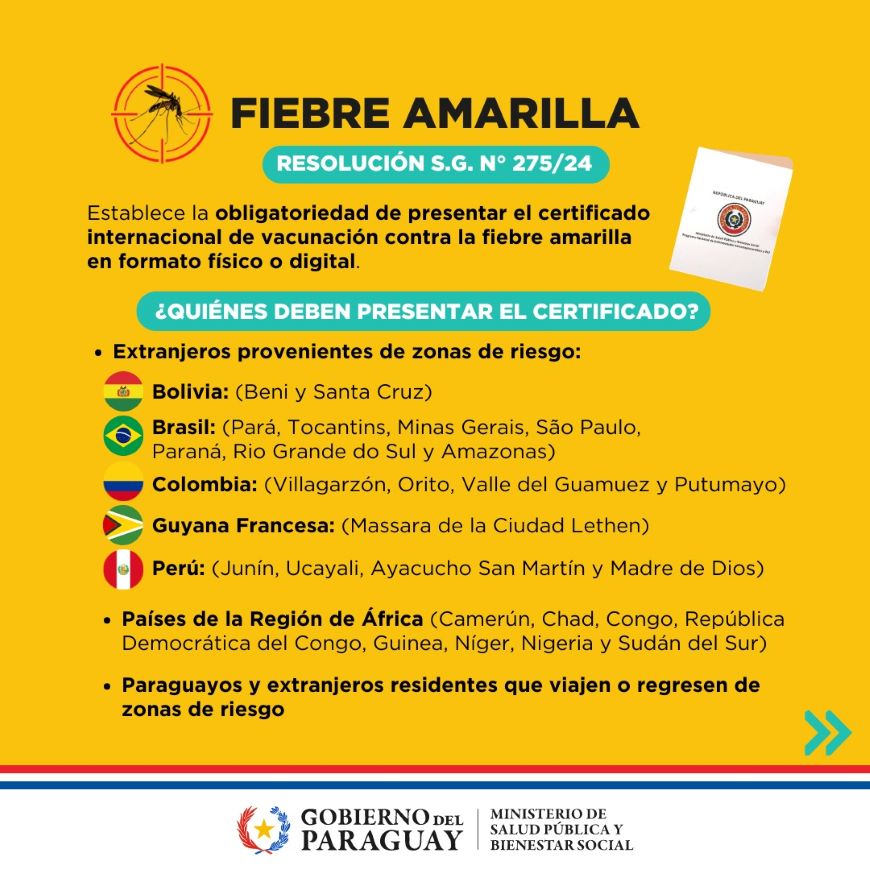 El Poder Ejecutivo a través del Ministerio de Salud Pública y Bienestar Social emitió la Resolución S.G. N° 275 que establece la obligatoriedad de presentar el Certificado Internacional de Vacunación contra la Fiebre Amarilla en formato físico o digital, como requisito para autorizar el ingreso al país de extranjeros provenientes de zonas de riesgo. Asimismo, este certificado será exigido tanto para la salida de extranjeros residentes en el país como para nacionales con destino a zonas de riesgo.
