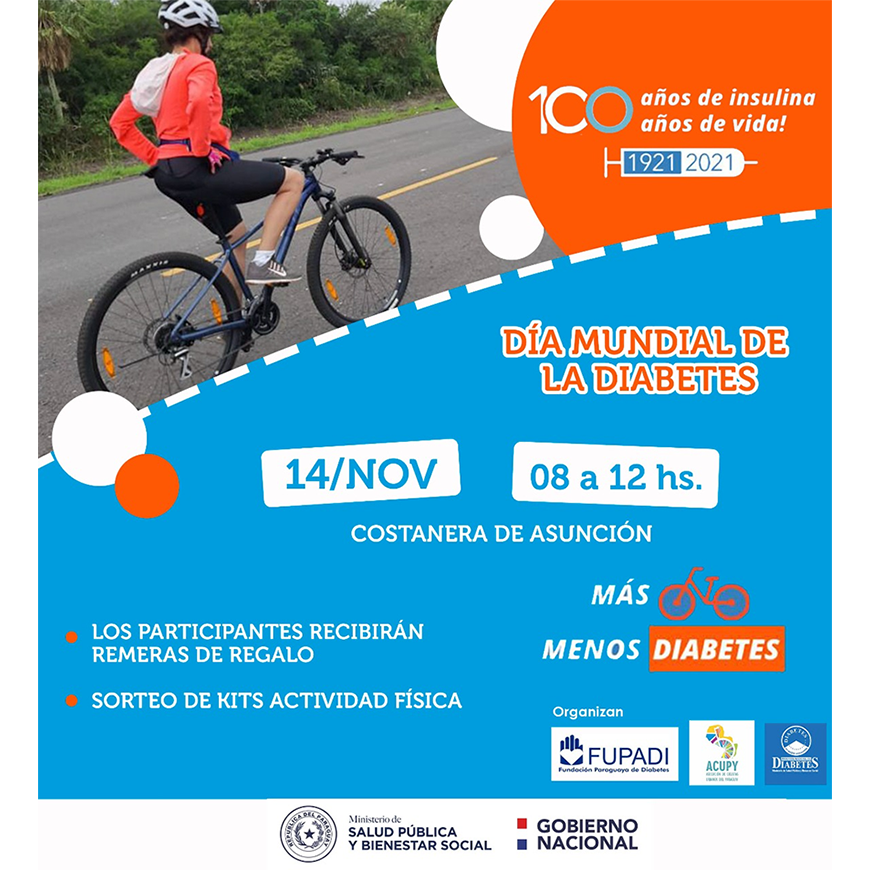Este 14 de noviembre se evoca el Día Mundial de la Diabetes, bajo el lema: “100 años de insulina, 100 años de vida” establecido en nuestro país para evocar esta fecha mundial que busca concienciar sobre esta enfermedad metabólica crónica. En este contexto, el Programa Nacional de la Diabetes del Ministerio de Salud llevará a cabo una jornada con diversas actividades en la Costanera de Asunción, orientada a toda la población.