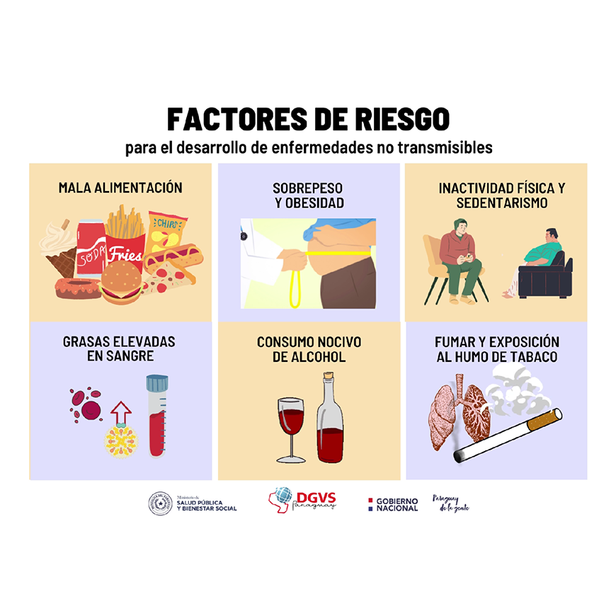 Los factores de riesgo para la salud son aquellos que aumentan la probabilidad de que una persona desarrolle enfermedades, como: la mala alimentación, grasas elevadas en sangre (colesterol y triglicéridos), sobrepeso y obesidad, consumo nocivo de alcohol, hábito de fumar y exposición al humo del tabaco, el sedentarismo y la inactividad física. Estos factores de riesgo predisponen a la aparición de las enfermedades no transmisibles. La buena noticia es que pueden modificarse.