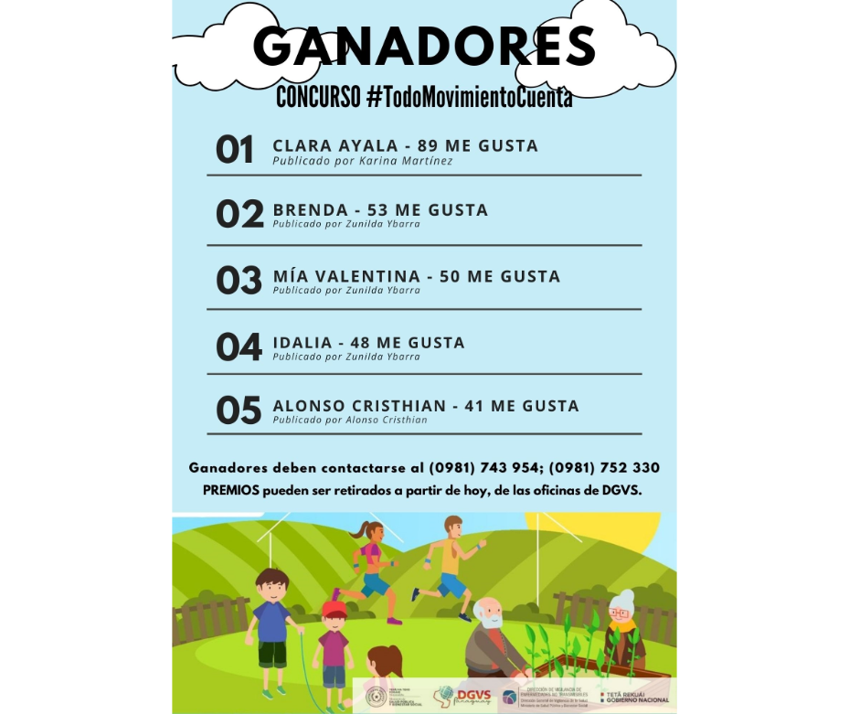 La Dirección de Vigilancia de Enfermedades No Transmisibles informa la lista oficial de los ganadores del Concurso #TodoMovimientoCuenta. La actividad está ligada a la celebración del Día Mundial de la Actividad Física, con el cual se busca fomentar la práctica diaria de actividad física para mantenernos activos y saludables. En la oportunidad participaron 28 concursantes, con un total de 15 vídeos y 13 fotos, en los cuales compartieron las diversas formas de mantenerse activos en esta pandemia.