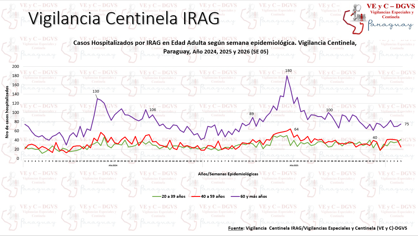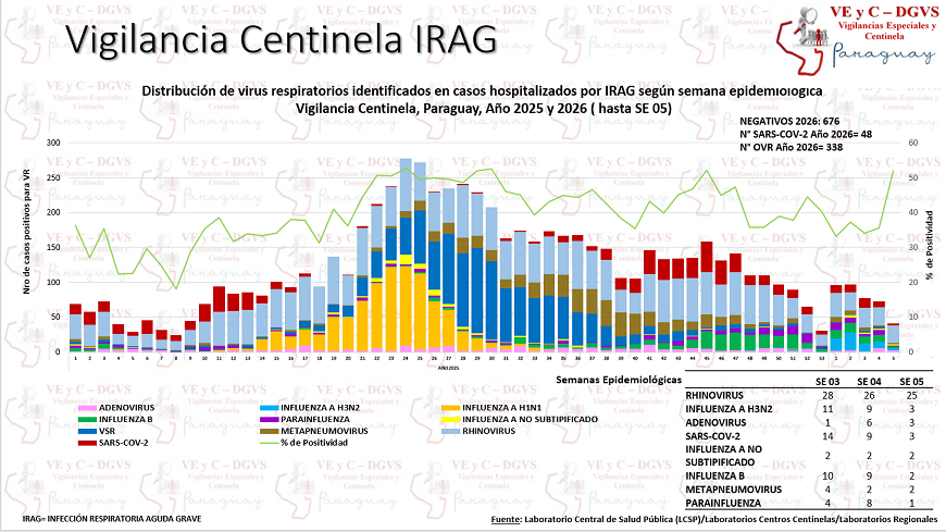 En cambio, se observó un aumento de hospitalizados en los últimos días. En la semana epidemiológica (SE) 05 se reportaron 247 hospitalizados por infecciones respiratorias agudas graves (IRAG) en los Centros Centinelas, evidenciando un incremento del 8% con relación a la semana anterior. El 19% de los hospitalizados ingresó a la unidad de cuidados intensivos.