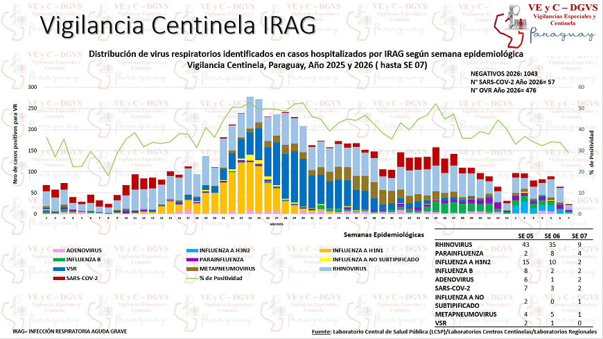 En lo que va del 2026 se han confirmado 30 fallecidos por virus respiratorios, de acuerdo con el reporte actualizado. De esto, 7 fallecidos corresponden a la última semana (SE) 07, asociados a virus respiratorios por: SARS-CoV2 (1), Parainfluenza B (1), Rhinovirus (3) y 2 coinfecciones por Influenza A H1N1 + Metapneumovirus (1), y Metapneumovirus + Rhinovirus (1).