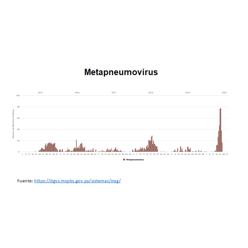 Metapneumovirus es el agente que destaca debido a una mayor identificación comparando las últimas 5 temporadas pre pandemia. Desde la SE 1 a la SE 25 se han registrado 368 casos positivos para Metapneumovirus con circulación sostenida desde la SE 16 alcanzando el pico en la SE 22 con 78 casos.  Los grupos etáreos más afectados son los menores de 5 años (61%) y el de 60 y más años (18%).