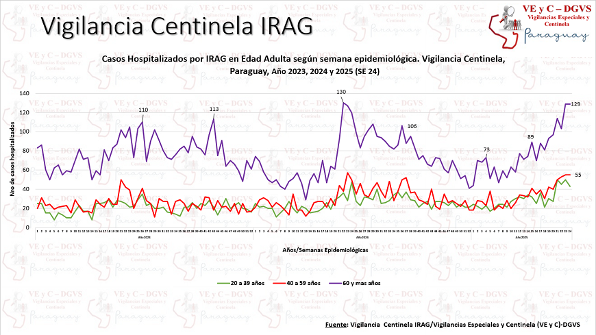 La Vigilancia Centinela también registra un ligero aumento en los hospitalizados por infecciones respiratorias agudas graves (IRAG). En la última semana, 453 pacientes fueron internados por infecciones respiratorias, de los cuales, 16% ingresó a la unidad de cuidados intensivos y 10% falleció. Entre los más afectados encabeza la franja de adultos mayores de 60 años (30%), le sigue el grupo de 5 a 19 años (19%) y el de niños de menos de 2 años (17%).