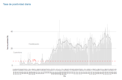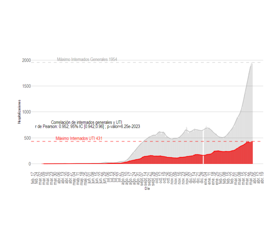 El número de internaciones en unidades de terapia intensiva (UTI) muestra un récord máximo de 431 pacientes en un día, con una tendencia al aumento sostenido desde mediados de febrero. Las internaciones generales muestran, además, un repunte desde inicios de febrero, con un nuevo máximo de 1.954 pacientes reportados en un único día.