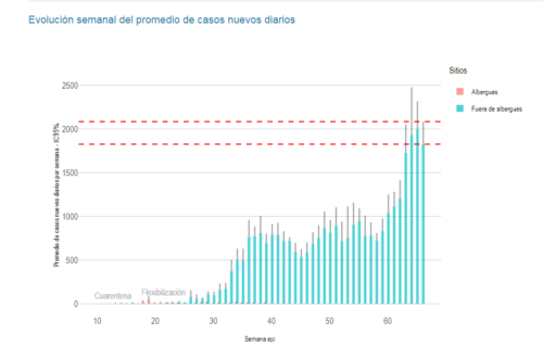 La reciente actualización del Reporte Semanal COVID-19 revela que el promedio diario de nuevos infectados es de 1.825, con un máximo registrado de 2.083 casos en el 95% del intervalo de confianza. Esto no representa un cambio significativo con respecto a las tres semanas previas. Luego de siete semanas consecutivas de cambio porcentual positivo se reporta un cambio porcentual negativo de -3% con respecto a la semana previa, lo que evidencia una interrupción de la tendencia de aumento en el número de nuevos infectados con el virus.