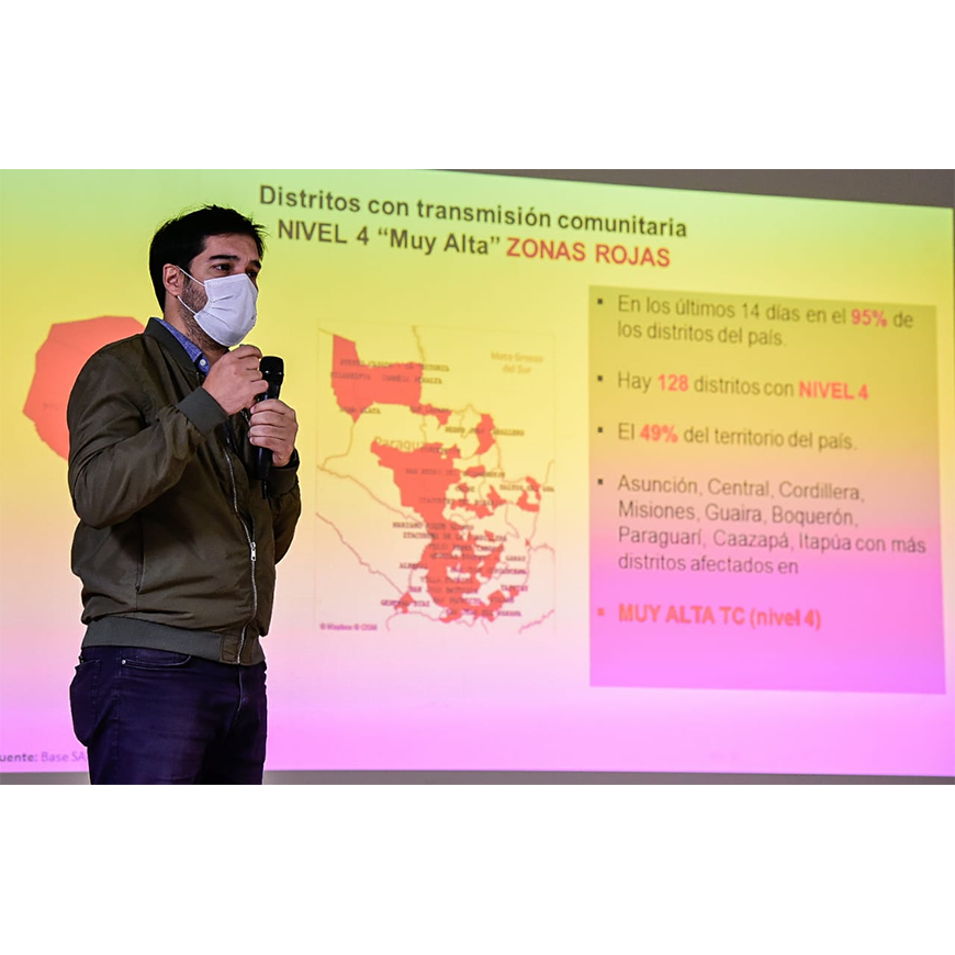 Reveló que en aquellos territorios que se encuentran en zona roja, actividades aparentemente inofensivas como una reunión de prensa puede resultar riesgosa; indicó en territorios con nivel 4 de transmisión comunitaria, al menos 3 a 4 personas tienen COVID-19, razón por la que es esencial redoblar los cuidados, sobre todo en zonas rojas. En territorios con otros colores, indicó que las probabilidades de riesgo son menores y no por eso más seguras, por lo que se insta bajo ninguna circunstancia relajarse con las medidas.