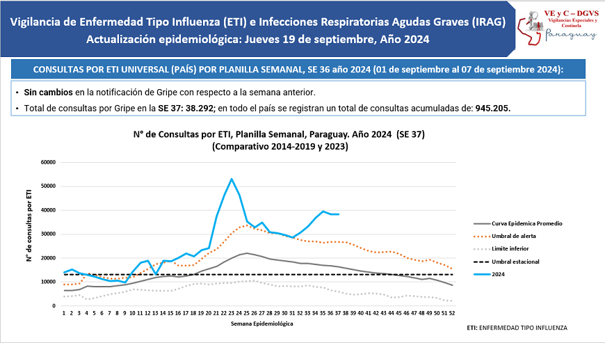 En la semana (SE) 37, se observa que la cifra de consultas por gripe se mantiene similar a la registrada en la semana anterior, con más de 38.200 consultas a nivel país, observándose una meseta de casos, por lo que la curva epidémica continúa por encima del umbral de alerta.