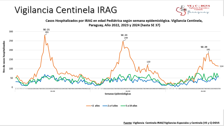 Se contabilizaron 404 hospitalizados por infecciones respiratorias agudas graves (IRAG) en los Centros Centinela, reflejando un ligero descenso de 1%, con relación a la semana anterior. La mayoría de los casos hospitalizados está asociado a cuadros de virus sincitial respiratorio y SARS-CoV2. El 56% de las internaciones corresponde a la edad pediátrica, siendo el 50% menores de 2 años y 44% a la edad adulta, de los cuales el 48% son mayores de 60 años.