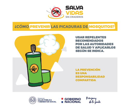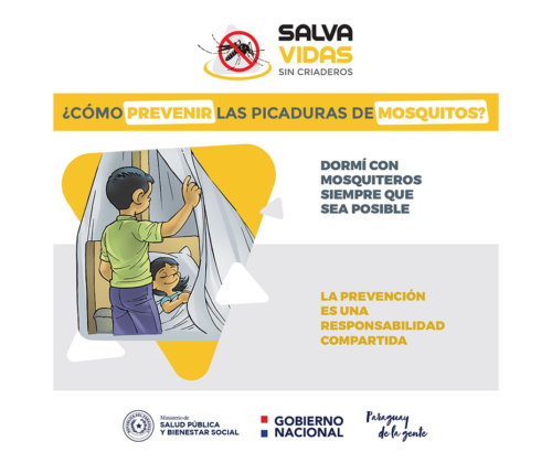 Para prevenir las picaduras de mosquitos se recomienda el uso de barreras de protección: aplicación de repelente para actividades al aire libre, uso de ropas que cubran la mayor parte de cuerpo y mosquitero para dormir.
