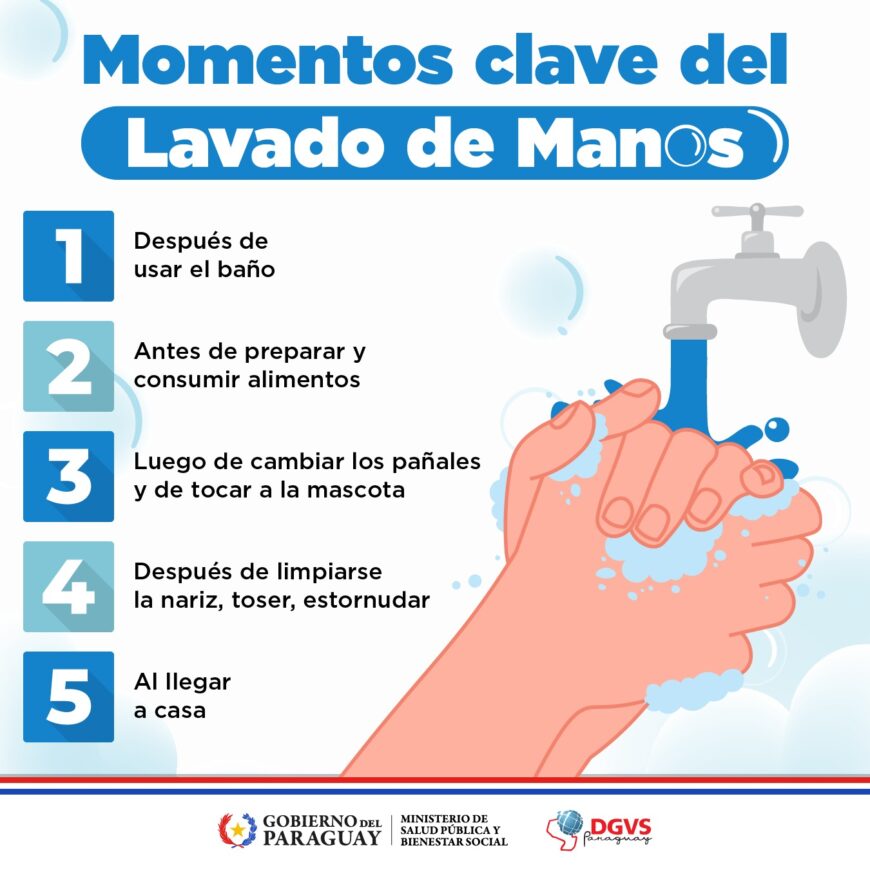 Lavar las manos como mínimo 40 segundos con abundante agua y jabón después de ir al baño y de toser o estornudar; antes de manipular y consumir alimentos, luego de tocar superficies contaminadas y la basura, después de cambiar pañales y de tocar a la mascota, y al llegar a la casa.