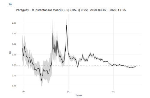La transmisibilidad (Rt) que hace referencia al promedio de contagios por infectados, se encuentra hasta el momento por debajo del umbral de 1, mostrando un leve incremento en contraste a lo observado la semana anterior. El total de casos confirmados revela un ritmo en tiempo de duplicación de 79 días.