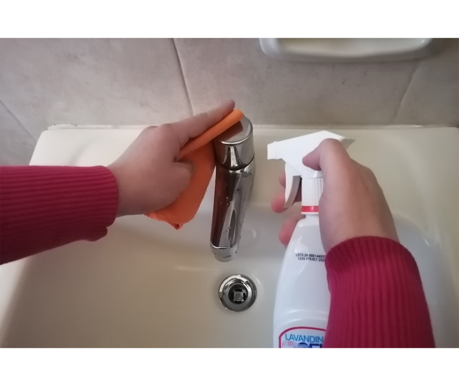 Refiere que el inodoro, la ducha y/o bañera, así como el lavamanos son áreas que deben limpiarse habitualmente, primero con agua y detergente. Dentro este proceso de limpieza se recomienda dejar para último momento la limpieza del inodoro. Posteriormente proceder a enjuagar todas las zonas jabonosas y luego pasar a la etapa de desinfección; para esto es necesario contar con lavandina (hipoclorito de sodio) diluida en agua y con la ayuda de un paño pasar la preparación por los artefactos y repasar el piso. No es conveniente mezclar el detergente con la lavandina, puesto que esto inactivaría la eficacia de ambos los productos.