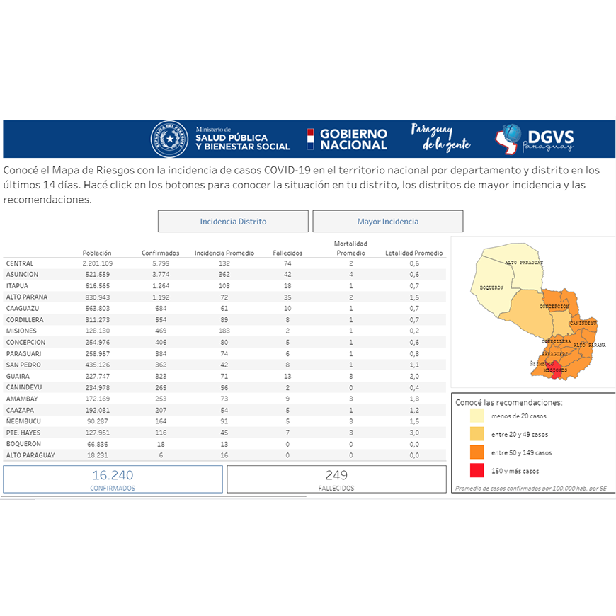 Los Distritos de más de 10.000 habitantes que en los últimos 14 días observan una alta tasa de incidencia son: Asunción, Ayolas, Caazapá, Concepción, Encarnación, Lambaré, Obligado, Pilar, San Bernardino, San Ignacio, San Juan Bautista, San Lorenzo y Villa Elisa.