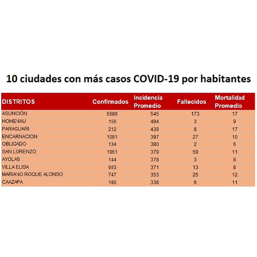 Dentro de este periodo, Asunción encabeza la lista de las ciudades dentro del territorio nacional con más contagios, con 5.680 casos positivos de COVID-19 y muestra una incidencia (número de casos nuevos) promedio de 545, el mayor de todos, de acuerdo al Mapa de Riesgos. Le sigue la ciudad Universitaria, San Lorenzo (Central) que contabiliza 1961 casos, cuya incidencia es de 379; y Encarnación (Itapúa) que presenta 1.081 infectados, con una incidencia de 397, mayor al del distrito de San Lorenzo.