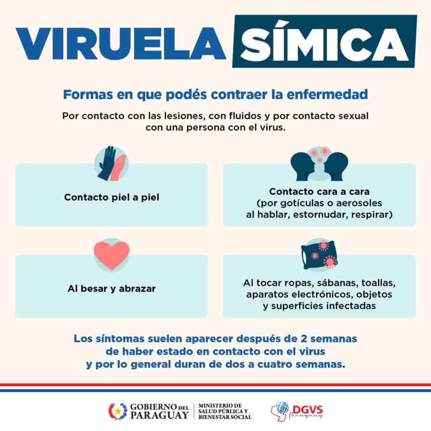 La viruela símica es una enfermedad que produce erupciones en la piel (parecidas a unos granos o ampollas), al igual que otras enfermedades; a menudo acompañadas de síntomas similares a la gripe (fiebre, dolor de cabeza, malestar general), por lo que es indispensable acudir a la consulta médica temprana para la evaluación y el diagnóstico oportuno, y de esta manera prevenir la diseminación de la enfermedad.