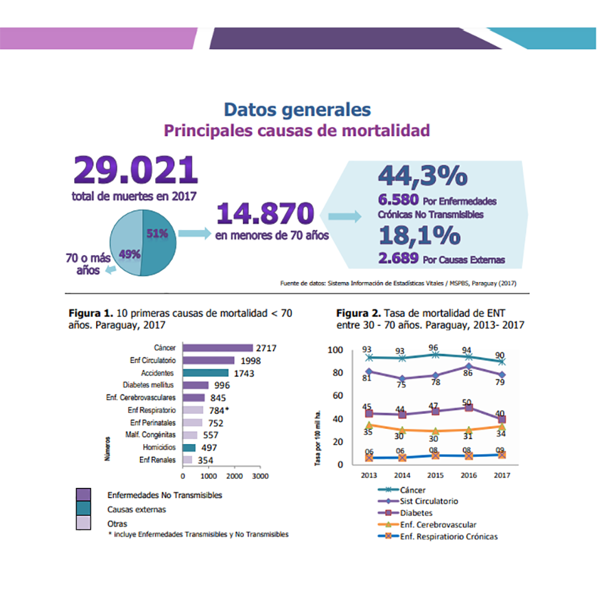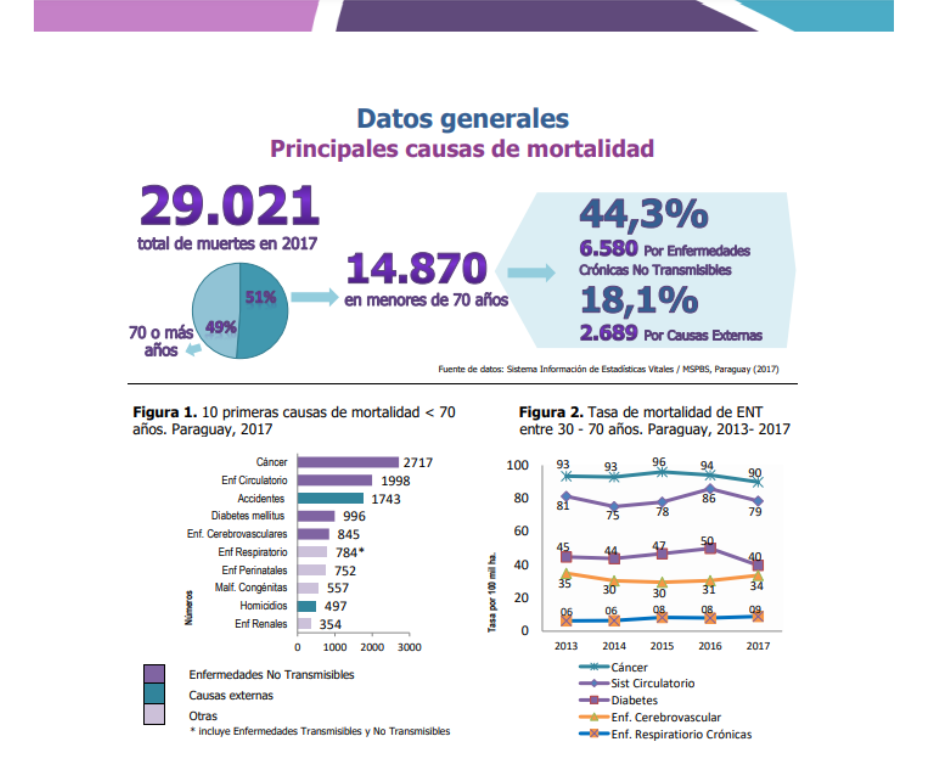 El Boletín de Vigilancia de Enfermedades No Transmisibles (ENT) y Factores de Riesgo en Paraguay señala que diez son las primeras causas de mortalidad prematura en el país, de acuerdo a datos del 2017, entre las que figura el Cáncer (2717), Sistema circulatorio (1998), Accidentes (1743), Diabetes mellitus (996), Enfermedades cardiovasculares (845), Enfermedades Respiratorias (784), Enfermedades perinatales (752), Malformaciones congénitas (557); Homicidios (497) y Enfermedades renales (354).