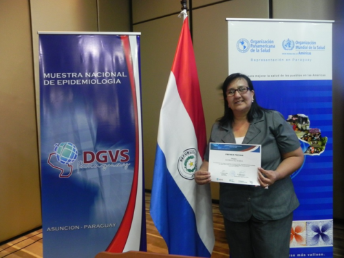 Finalmente se brindó un reconocimiento a la mejor egresada del Programa de Entrenamiento de Epidemiología de Campo, en nivel básico, a Jazmín Vera, quien en la ocasión presentó acerca de la “Caracterización de los casos de tuberculosis diagnosticados en el Hospital Regional de Ciudad del Este, de enero a octubre de 2018”.