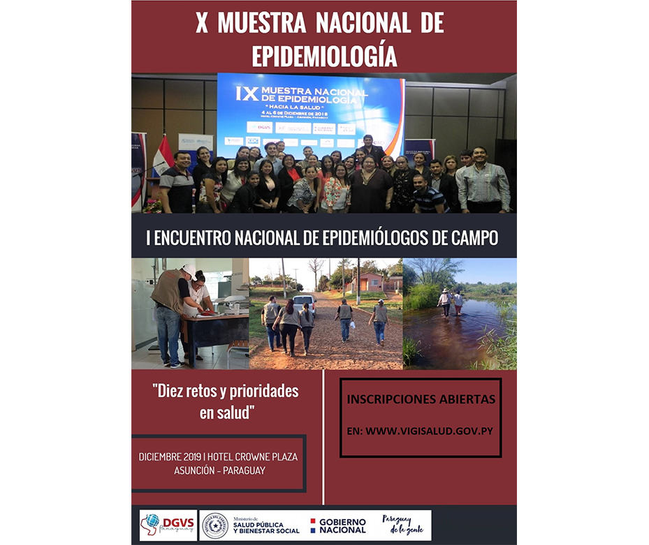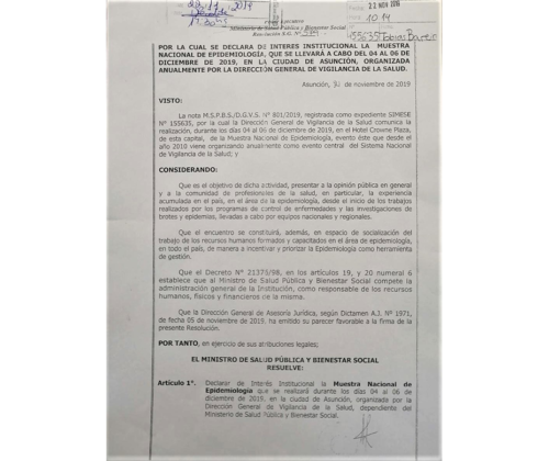 En virtud a la Resolución S.G. N° 579/2019, el Ministerio de Salud Pública y Bienestar Social declaró de interés institucional la Muestra Nacional de Epidemiología a realizarse del 4 al 6 de diciembre, en el hotel Crowne Plaza de Asunción, por la Dirección General de Vigilancia de la Salud.