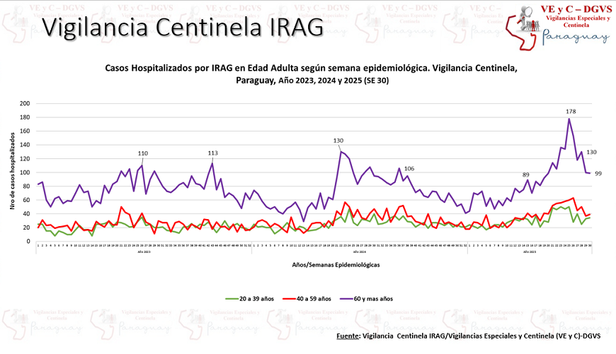 En los centros centinela se registró 429 hospitalizados por infecciones respiratorias agudas graves (IRAG), evidenciando un leve descenso de 1%, con relación a la semana anterior. El 26% de los hospitalizados ingresó a la Unidad de Cuidados Intensivos y 4% falleció.
