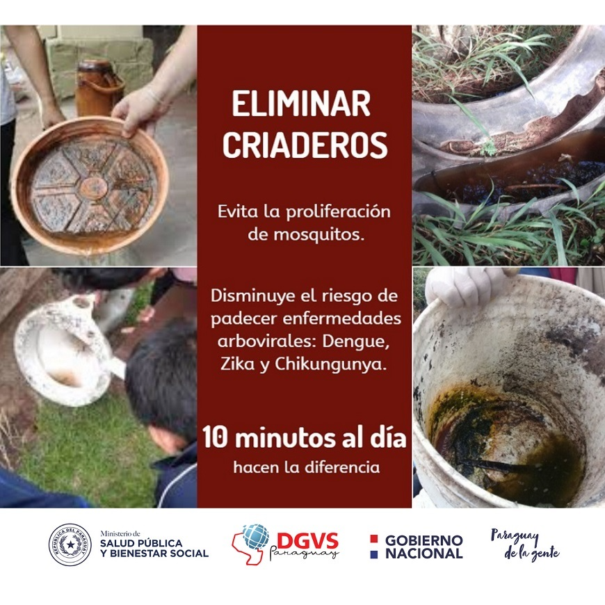 Desde la Dirección de Vigilancia de la Salud se insta a la ciudadanía a realizar una revisión diaria del patio y del interior de la casa; desechar todo objeto en desuso que acumule agua. Aquellos objetos inservibles que no puedan desecharse como aparatos domésticos, neumáticos u otros, deben colocarse bajo techo o cubrirse de forma a evitar que puedan acumular agua. Tambores o recipientes con agua que será utilizada, deben mantenerse herméticamente tapados.