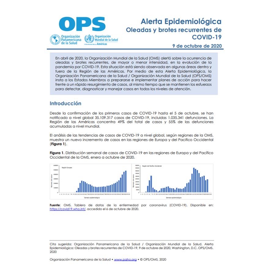 La OPS/OMS insta a los Estados Miembros a preparar los servicios de salud para enfrentar oleadas y brotes recurrentes, que tienen lugar en distintos sitios dentro del mismo país, simultáneamente o en diferentes momentos, a medida que las actividades económicas empiezan a reactivarse. Al mismo tiempo hace un llamado para que se mantengan los esfuerzos para garantizar el acceso de la población a pruebas de diagnóstico, así como asegurar el manejo adecuado de pacientes en todos los niveles del sistema de atención de salud.