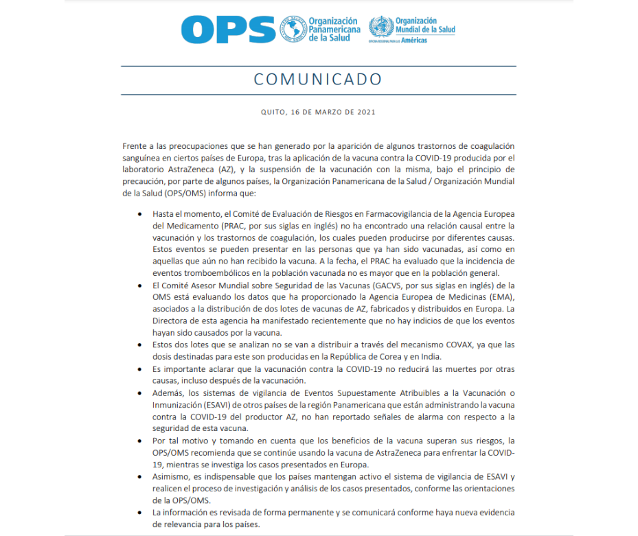 La Organización Panamericana de la Salud/Organización Mundial de la Salud (OPS/OMS) lanzó un comunicado con relación a la preocupación que se ha generado por posibles efectos adversos generados por la vacuna producida por el laboratorio AstraZeneca y la suspensión de la vacunación temporal en algunos países de la Unión Europea.