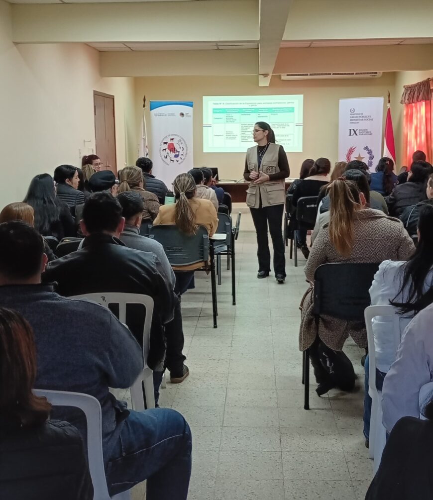 Recientemente, profesionales de salud de la Novena Región Sanitaria – Paraguarí participaron de una jornada de capacitación y actualización técnica en vigilancia y control de enfermedades zoonóticas de importancia en salud pública, que se realiza en el marco del Plan Estratégico para la Eliminación de la Rabia Humana Transmitida por Perros en Paraguay.