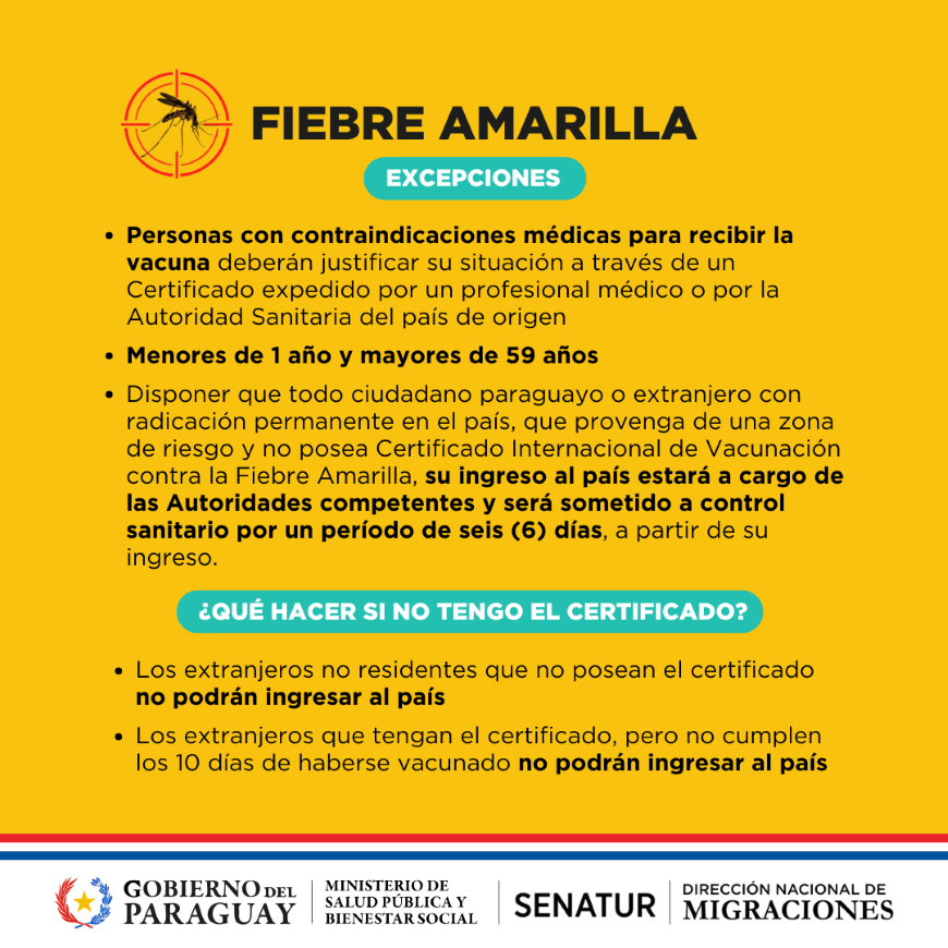 Entre los puntos principales, el Artículo 3 de la resolución dispone que todo ciudadano paraguayo o extranjero con radicación permanente en el país, que provenga de una zona de riesgo y no posea Certificado Internacional de Vacunación contra la Fiebre Amarilla, su ingreso al país estará a cargo de las Autoridades competentes y será sometido a control sanitario por un período de seis (6) días, a partir de su ingreso.