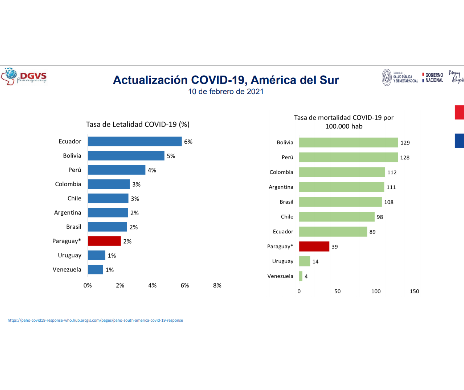 Fuentes: Reporte COVID-19 – DGVS http://dgvs.mspbs.gov.py/files/boletines_covid19/SE05_2021_Boletin_Covid19.pdf / Tabla de datos OMS https://covid19.who.int/table