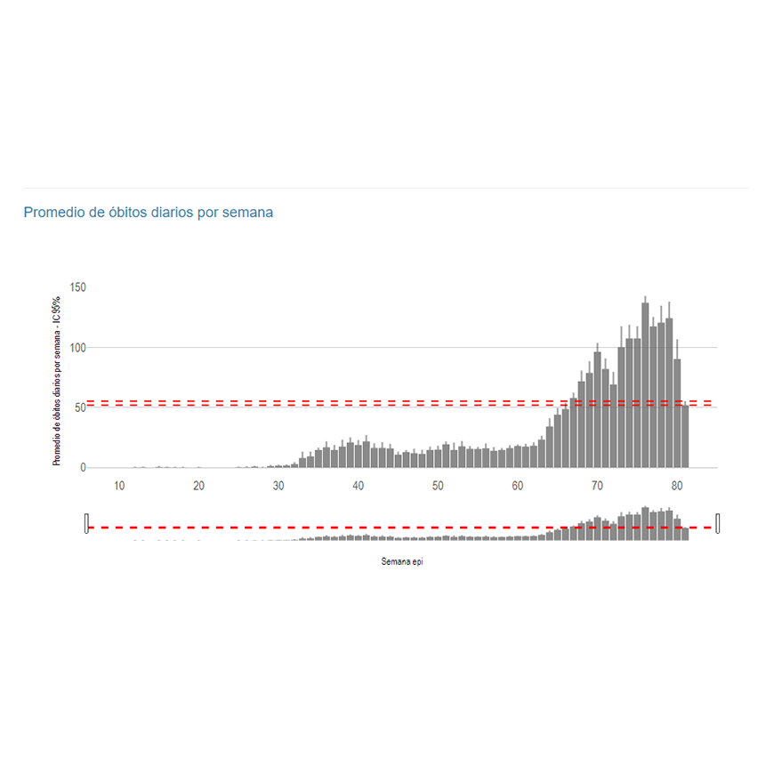 El promedio de la tasa de positividad diaria es de 25.7%. Esto último se reporta en función a un promedio diario de 5 326 muestras procesadas. La tasa promedio de testeo actual muestra un -38% de descenso con respecto al máximo reportado en la semana 23.