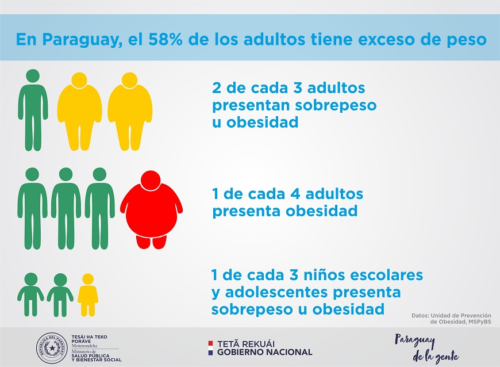 La prevalencia de sobrepeso y obesidad en Paraguay es del 58% en la población adulta, y 34,5% en niños y adolescentes; es decir, 6 de cada 10 adultos y 1 de cada 3 niños tienen exceso de peso.