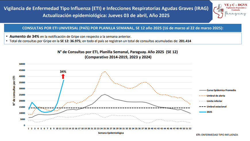 De acuerdo al último reporte de Vigilancia de la Salud, se notificaron 36.975 consultas por gripe al cierre de la semana epidemiológica (SE) 12, reflejando un incremento del 34% con relación a la semana anterior. La curva de tendencia se mantiene por encima del umbral de alerta.
