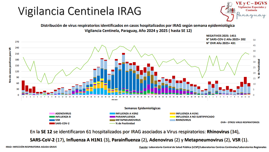 Hasta la (SE) 12 se registraron 2.182 hospitalizados por infecciones respiratorias agudas graves (IRAG), de los cuales, 246 corresponden a los hospitalizados de la última semana. El mayor porcentaje de internados se ubica en el grupo pediátrico menor de 2 años, seguido de la franja adulta mayor de 60 años.