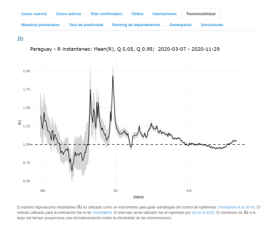 Desde hace unos días, Paraguay viene experimentando un acelerado ritmo de aumento de casos, con una transmisibilidad (Rt) -promedio de contagios por infectado reportados- por encima del umbral de uno, evidenciando una tendencia creciente en la curva epidémica.: “cerramos noviembre recuperando el ritmo de principio de octubre que fue la temporada más dura con alta ocupación de camas de terapia intensiva”, declaró el titular de Vigilancia de la Salud, Guillermo Sequera.