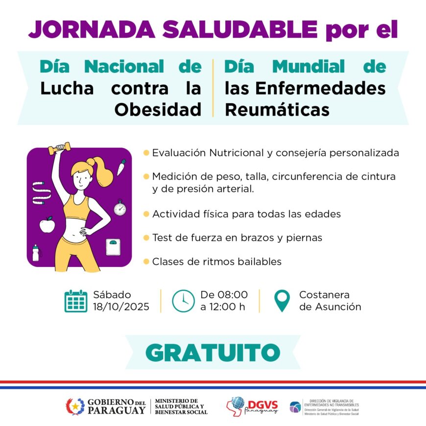 Como parte de las actividades conmemorativas por el Día Nacional de Lucha contra la Obesidad (11 de octubre) y el Día Mundial de las Enfermedades Reumáticas (12 de octubre), el Ministerio de Salud Pública, a través de la Dirección de Vigilancia de Enfermedades No Transmisibles, en conjunto con el Programa Nacional de Prevención, Tratamiento, Control y Asistencia de la Artritis Reumatoidea y Enfermedades Reumáticas Autoinmunes y Sistémicas tiene previsto llevar adelante una “Jornada saludable”, en la Costanera de Asunción, con servicios gratuitos para todas las edades.