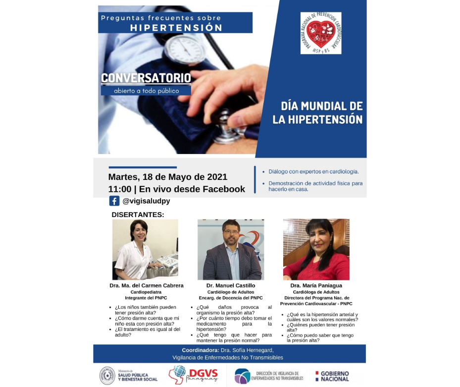 Este martes, 18 de mayo, te invitamos a conectarte al Facebook para que conozcas todo acerca de la hipertensión arterial, en el marco de un conversatorio que será presentado por el Programa Nacional de Prevención Cardiovascular y la Dirección de Enfermedades No Transmisibles, en recordación al Día Mundial de la Hipertensión.