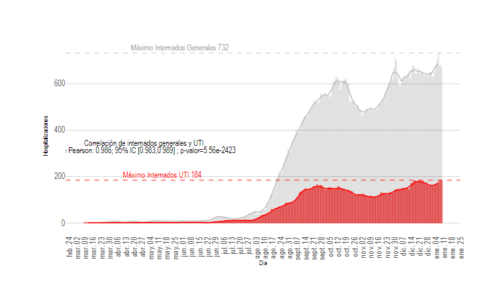 En cuanto a hospitalizaciones, las internaciones en la semana transcurrida reportan un nuevo máximo diario de 732 en contraste a las semanas anteriores al año anterior. Así también, las internaciones en Unidades de Terapia Intensiva (UTI) contabilizan un nuevo máximo de 184 casos.